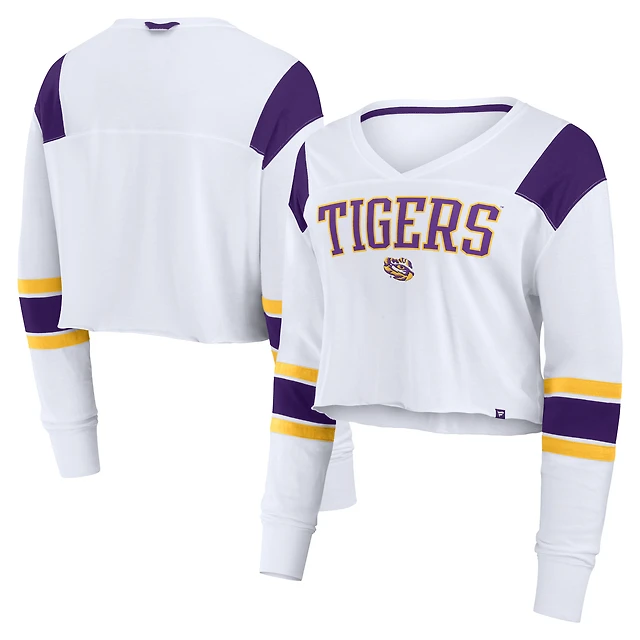 Women's Fanatics White LSU Tigers Training Camp Cropped Long Sleeve V-Neck Fashion Top