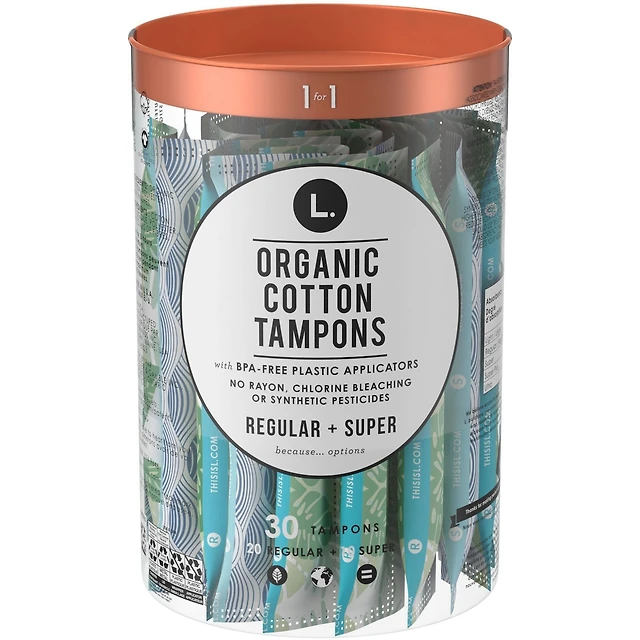 L. Organic Cotton Tampons Regular Absorbency, Free of Chlorine Bleaching, Pesticides, Fragrances, or Dyes, BPA-free Plastic Applicator, 30 Count