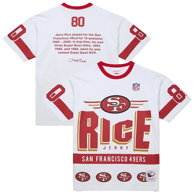 Men's Mitchell & Ness Jerry Rice White San Francisco 49ers Name Number Team Origins Vintage Logo T-Shirt