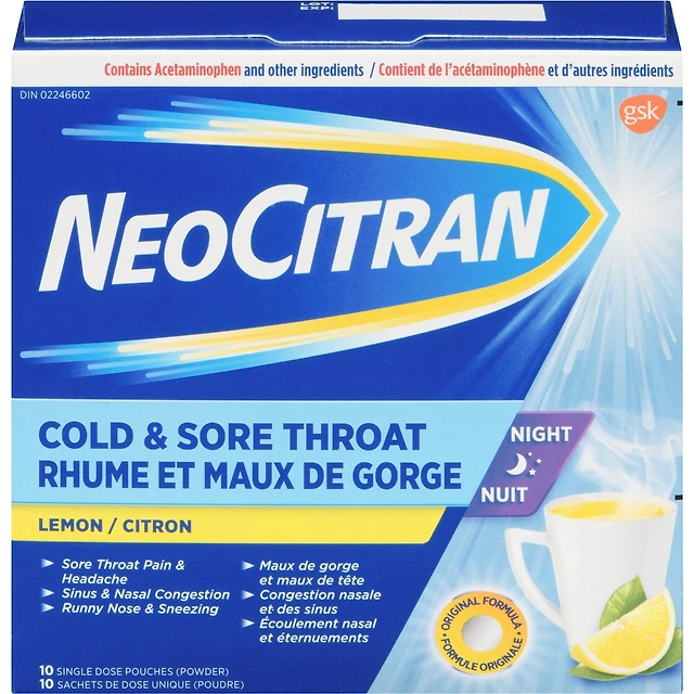 NeoCitran Cold & Sore Throat Night Hot Liquid Medication Regular Strength Lemon 10 pack