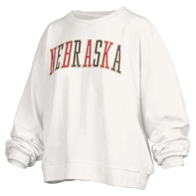 Women's Pressbox White Nebraska Huskers Janise Sequin Waist Length Oversized Pullover Sweatshirt