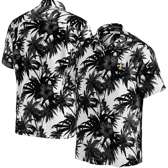 Men's Tommy Bahama Black New Orleans Saints Sport Harbor Island Hibiscus Camp Button-Up Shirt