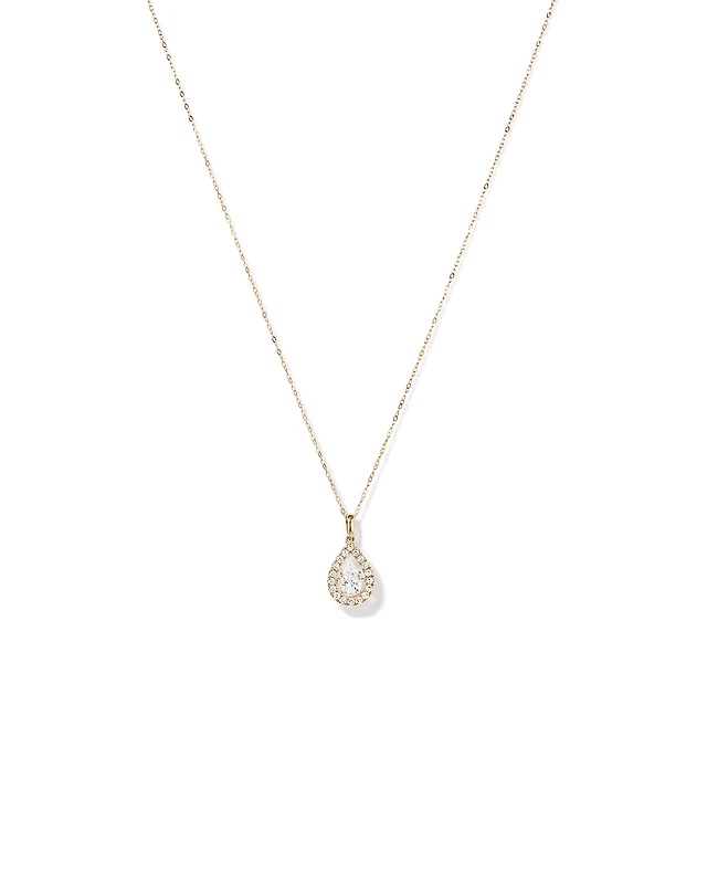 Pear Cut Created Sapphire and Diamond Halo Pendant Necklace in 10kt Yellow Gold