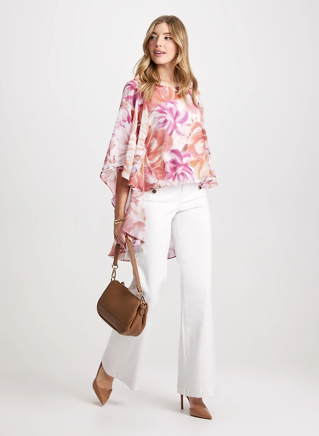 Asymmetric Floral Print Blouse & Pull-On Frayed Capri Jeans