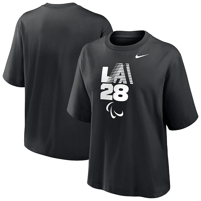 Women's Nike Black LA28 Summer Paralympics Retro Stripe Logo Boxy T-Shirt