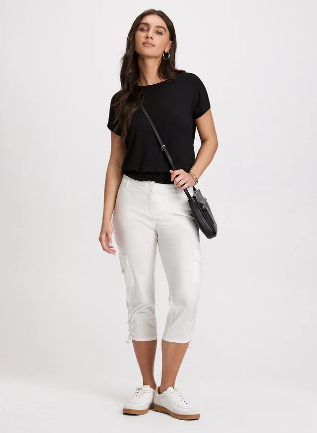 Smocked Waist T-Shirt & Rolled-Cuff Denim Capris