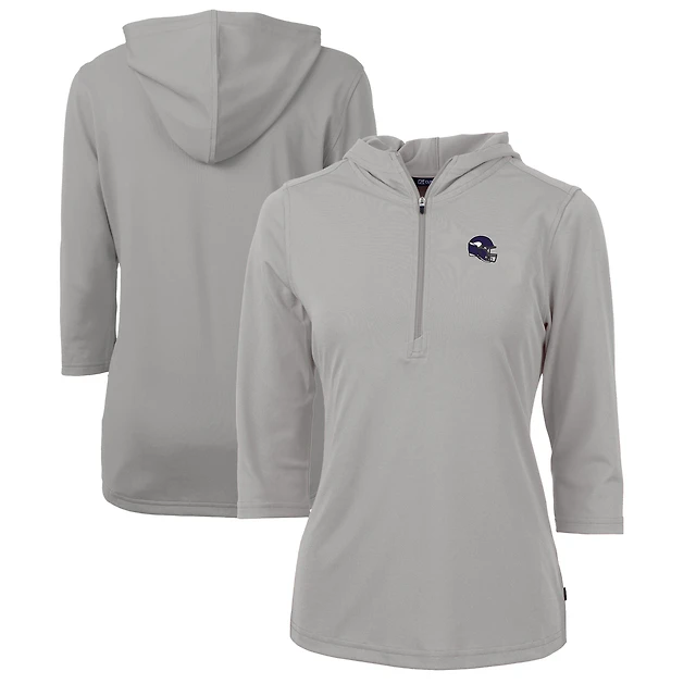 Women's Cutter & Buck Heather Gray Minnesota Vikings Helmet Logo DryTec Virtue Eco Pique Recycled 3/4-Sleeve Half-Zip Pullover Hoodie