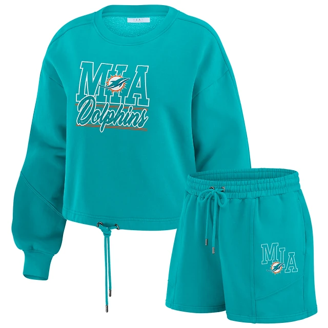 Women's WEAR by Erin Andrews Aqua Miami Dolphins Washed Fleece Long Sleeve T-Shirt & Shorts Lounge Set