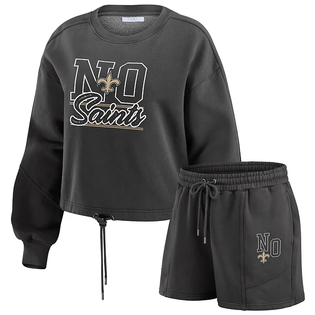 Women's WEAR by Erin Andrews Black New Orleans Saints Washed Fleece Long Sleeve T-Shirt & Shorts Lounge Set