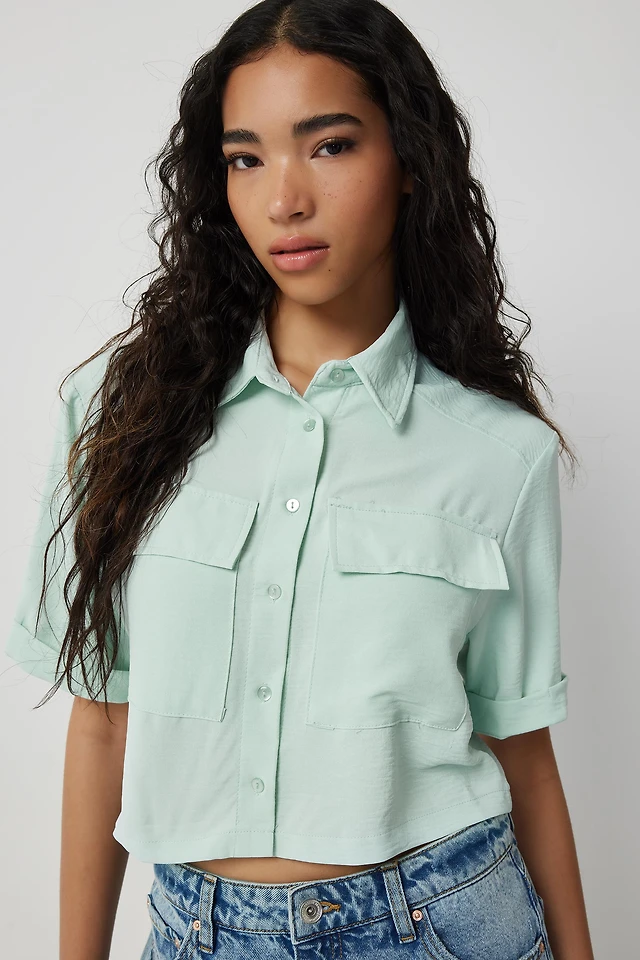 Ardene Crop Button Up Shirt in Light Green | Size Large | Polyester