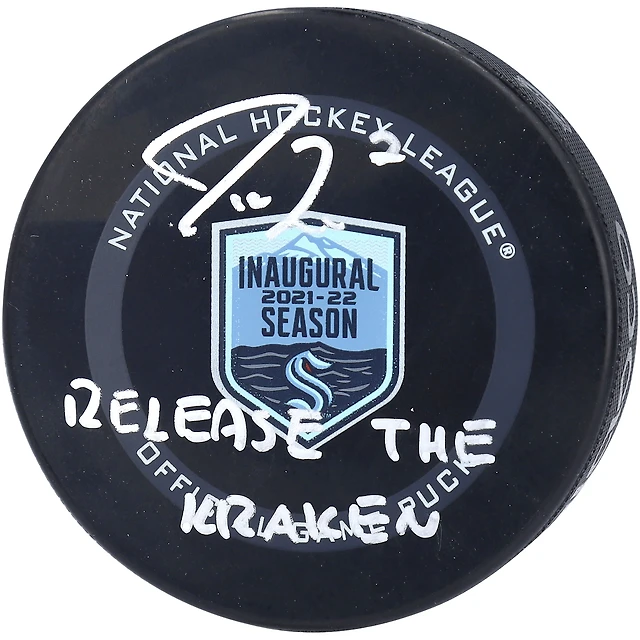 Jordan Eberle Seattle Kraken Autographed 2021-22 Inaugural Season Official Game Puck with "Release The Kraken" Inscription