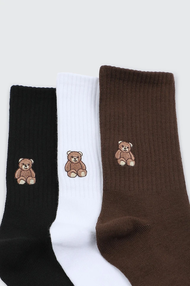 Ardene 3-Pack Crew Socks with Bear Embroidery | Polyester/Spandex