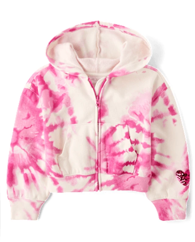 Girls Tie Dye Sequin Heart Fleece Zip Up Hoodie