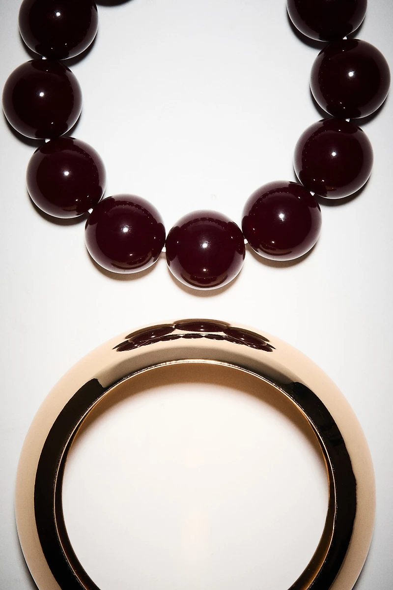 Bracelets in different designs. One metal bangle and one bracelet with large plastic beads.