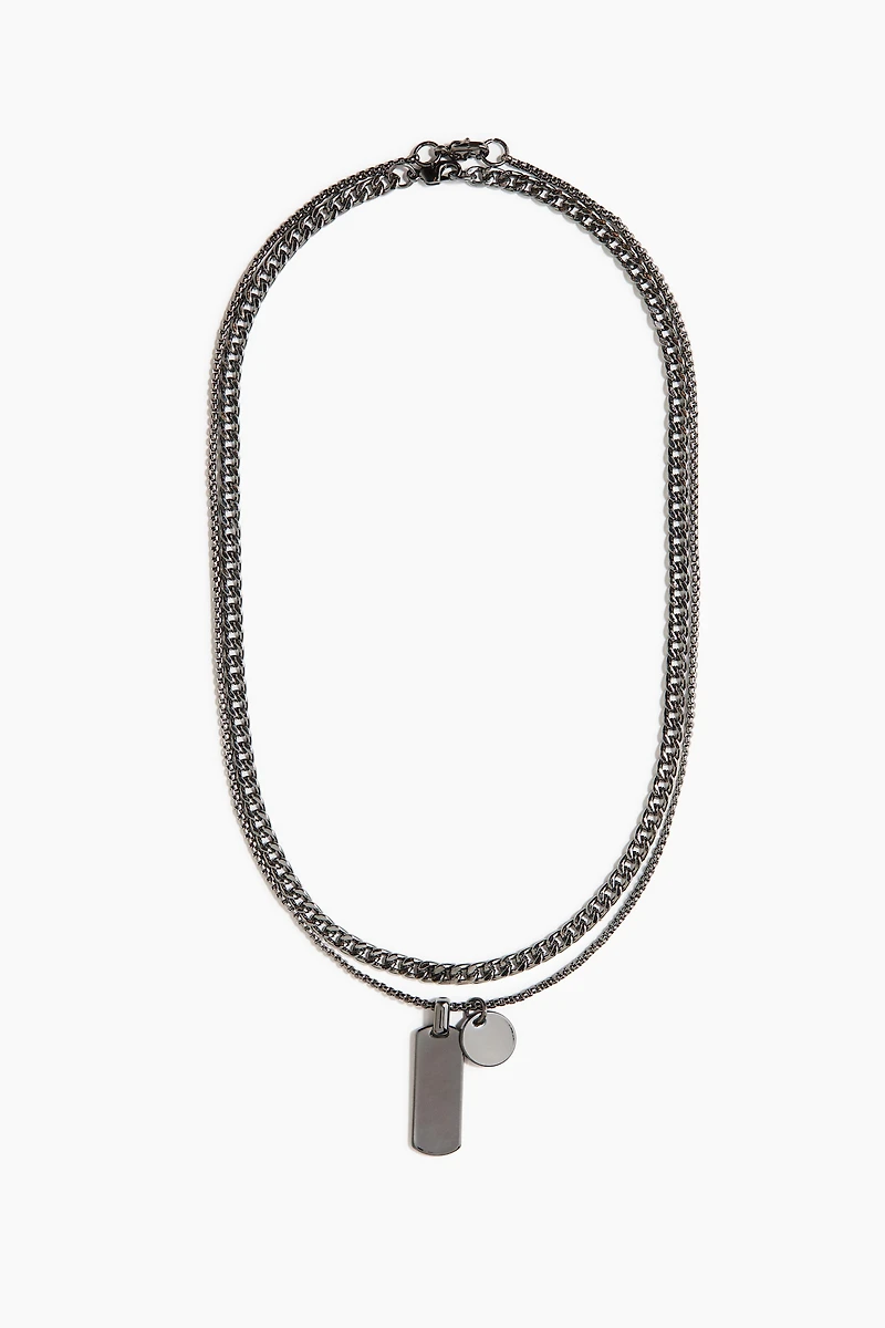 Necklaces in metal chain with different designs, including one chain with two pendants. Trigger clasp.