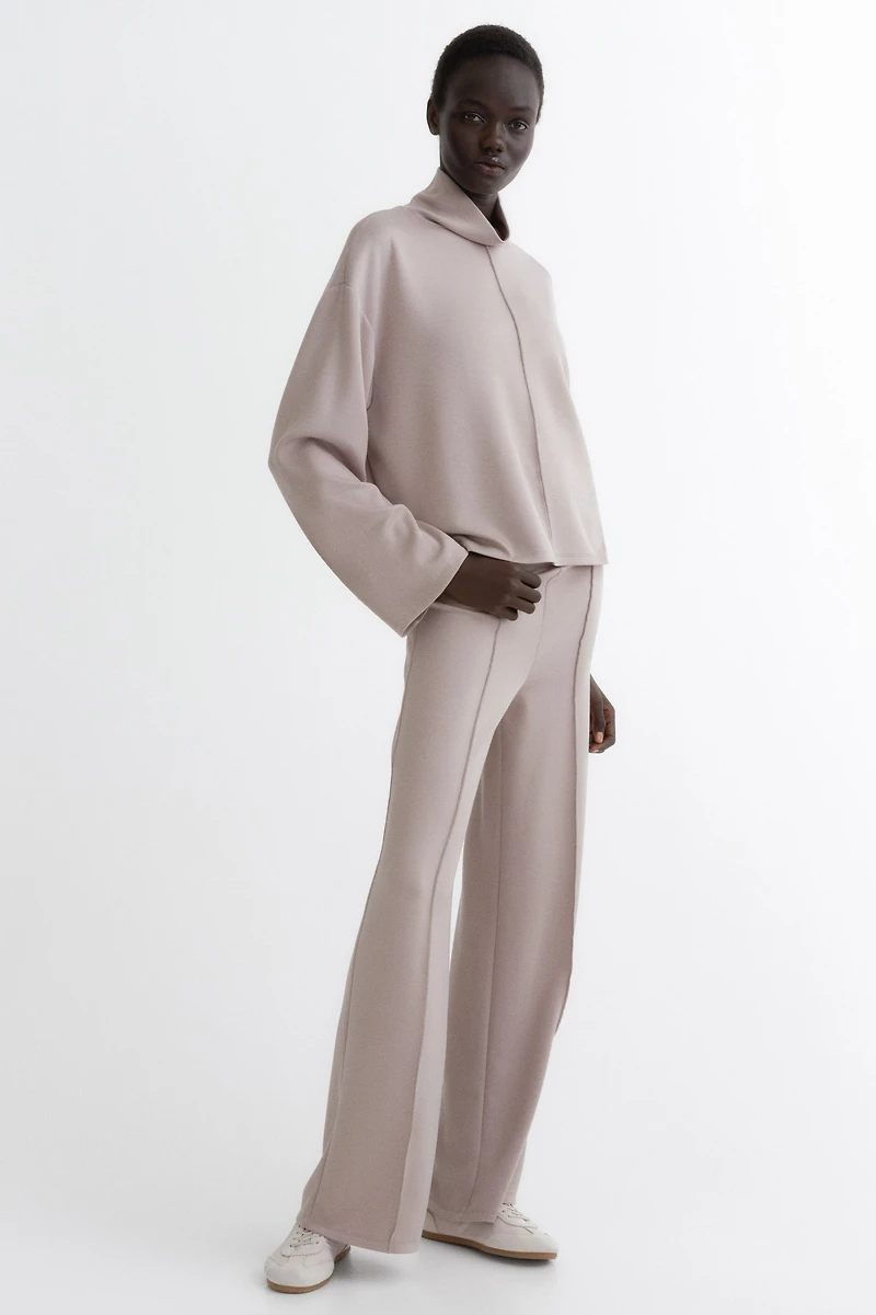 Set in thick jersey with a top and pants. Top with a double-layered mock turtleneck, visible seam at front, dropped shoulders, and long sleeves. Pants with an elasticized waistband and straight legs with stitched creases at front.