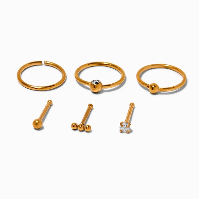 20G Gold-tone Titanium Cubic Zirconia Nose Studs & Hoops - 6 Pack