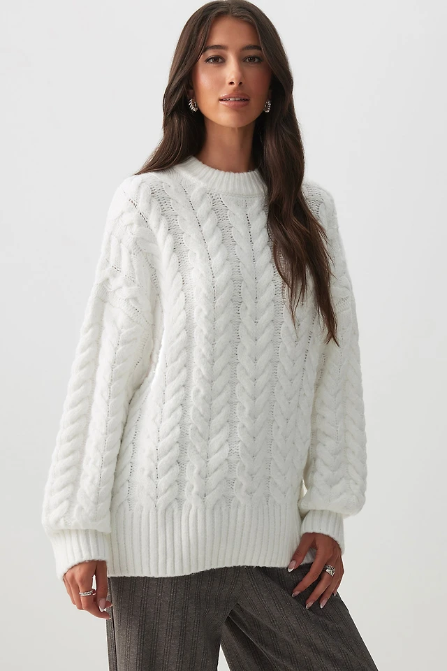 Ardene Oversized Cable Knit Sweater in Off-White | Size | Polyester | Eco-Conscious