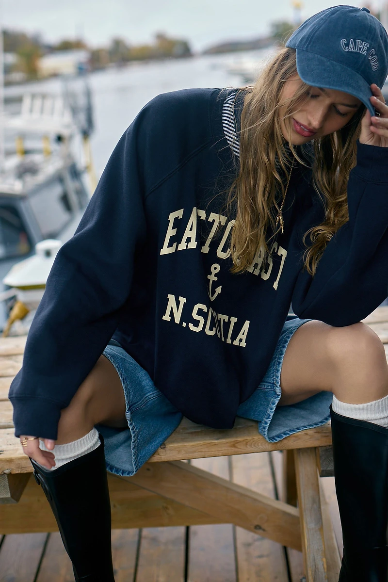 Fleece-lined sweatshirt. Ribbed crew neck Raglan sleeves Oversized fit 60% cotton, 40% polyester Model is wearing size XS/SFor size XS/S, select SFor size L/XL, select L | Ardene Printed Raglan Crew Neck Sweatshirt in Dark Blue | Size Small | Polyester/Cotton | Fleece-Lined
