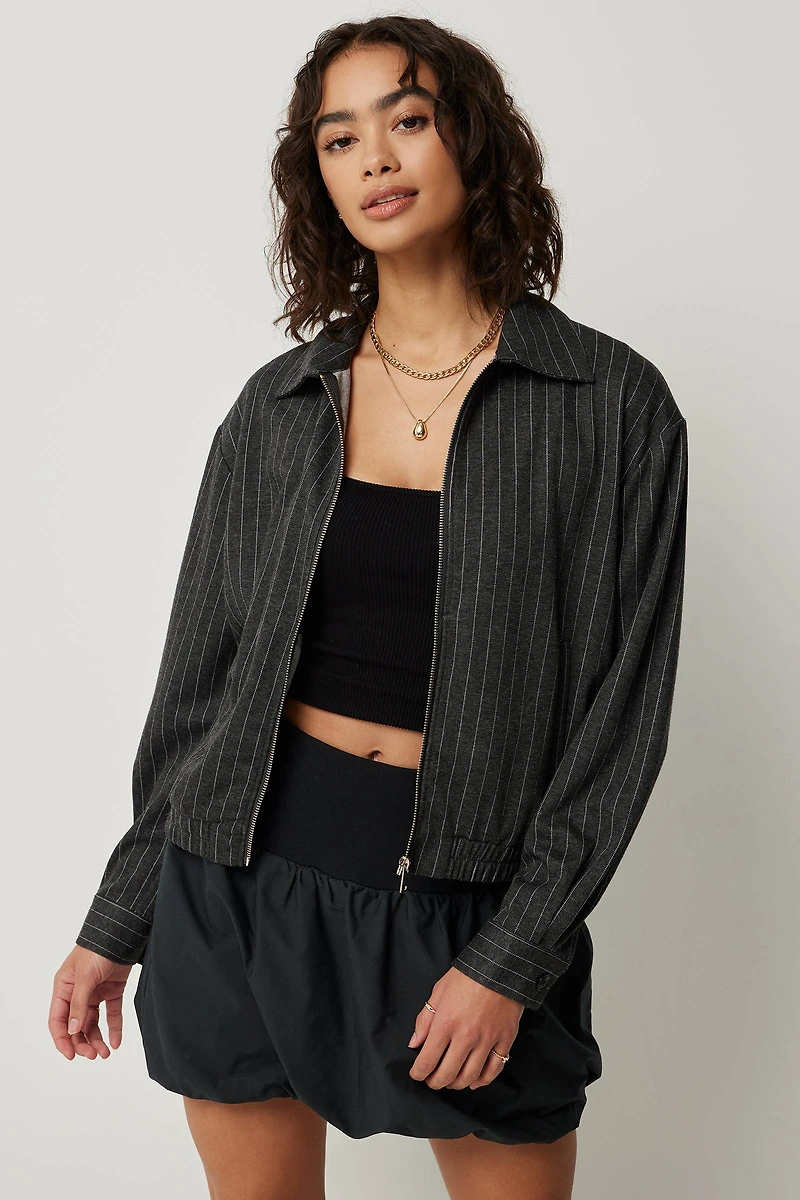 Light jacket. Point collar Zipper closure Slant pockets Buttoned cuffs Elastic hem 56% polyester, 40% rayon, 4% spandex Model is wearing size S | Ardene Striped Collared Jacket in Dark Grey | Size Large | Polyester/Rayon/Spandex