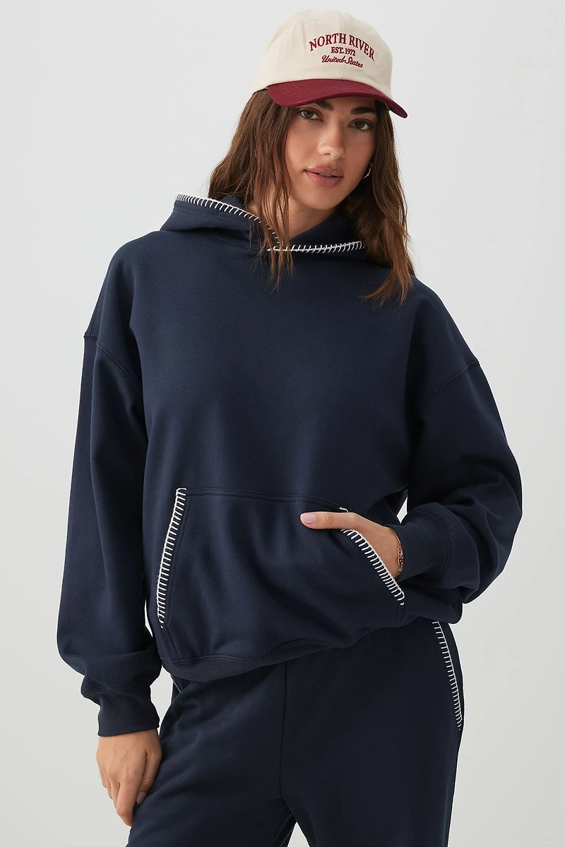 Fleece-lined hoodie. Long sleeves Kangaroo pouch Whipstitch details Model is wearing size SMatching bottom: 6A-AP30656-01Composition & Care 80% cotton, 20% polyester Wash inside out in cold water in delicate cycle Do not bleach Hang to dry Iron on low settings if needed Do not dry-clean | Ardene Whipstitch Oversized Hoodie in Dark Blue | Size XS | Polyester/Cotton | Fleece-Lined