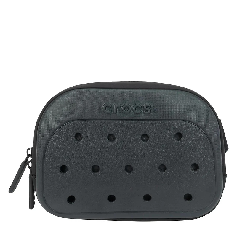 Experience hands-free convenience with the sleek black Crocs belt bag, crafted from durable synthetic material. Its main compartment secures your essentials with a zipper, complemented by an exterior zip pocket and an interior slip pocket for organized storage. The adjustable webbing strap, detailed with Crocs branding, extends up to 43 inches for a perfect fit. Personalize it with Jibbitz™ charms using the 13 front-panel holes for a unique touch (not included).