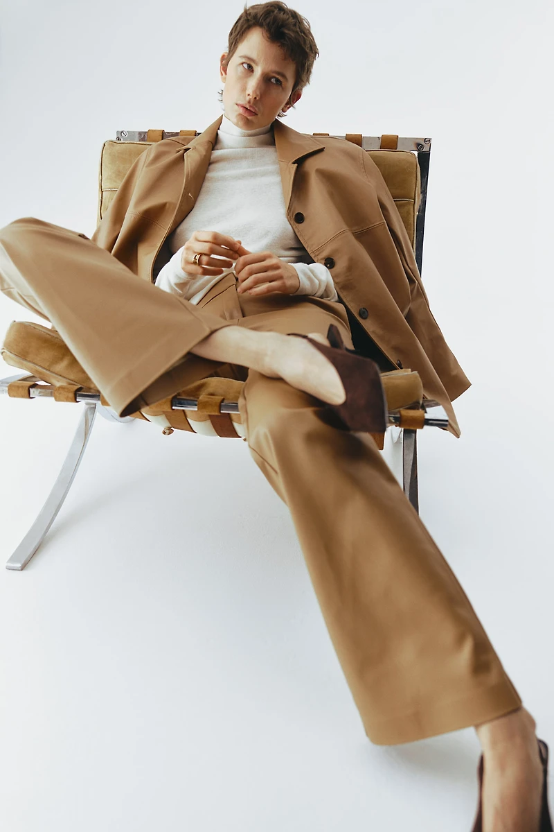 Fitted pants in coated fabric. High waist, concealed button and hook-and-bar fastening, and a zip fly. Diagonal side pockets, mock welt back pockets, and bootcut legs.