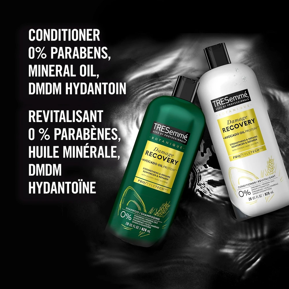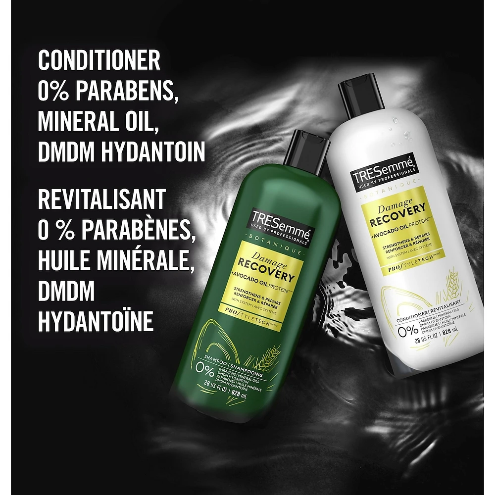 - DAMAGE RECOVERY SYSTEM: TRESemmé Botanique Damage Recovery Conditioner for damaged hair helps nourish weak and damaged cuticles, restoring smoothness and strength; PRO STYLE TECHNOLOGY™: With amino acids & ceramide, the salon-level technology in this conditioner makes hair 3x stronger and more manageable, when used as a system versus a non-conditioning shampoo; AVOCADO OIL PROTEIN: This TRESemmé hair repair conditioner with Avocado Oil Protein, is made with wheat proteins and avocado oil to prevent futher hair breakage; TRUSTED INGREDIENTS: This TRESemmé conditioner for damaged hair is PETA-approved and is free from Parabens, Mineral Oil, and DMDM Hydantoin; HAIR CARE TIPS FROM OUR STYLISTS: Use with TRESemmé Botanique Damage Recovery Shampoo for lasting hair strength; NEW LOOK, SAME SALON PROFESSIONAL QUALITY: Professional and affordable salon quality hair care products you can trust