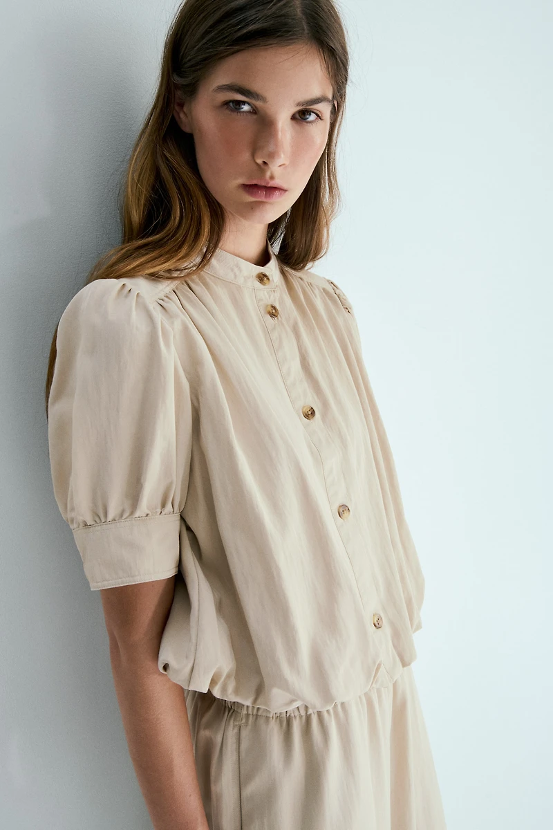 Blouse in soft twill with a bubble hem for a puffy silhouette. Band collar, buttons at front, and a gathered yoke at back. Forward-facing shoulder seams and short puff sleeves with button at cuffs.