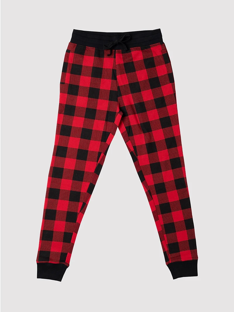 The timeless red-and-black check brings that iconic Canadian charm, while the jogger-style cuffs add a modern, flattering touch. With a relaxed fit, adjustable drawstring waist, and pockets for your must-haves, they’re the perfect blend of comfort and cozy style — made for matching moments with the whole family.
