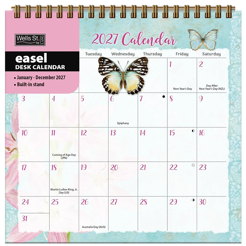 Pump up your desk game with the Wells Street by LANG Butterflies 2027 Easel Desk Calendar! Featuring mesmerizing artwork of stunning butterflies by Jane Shasky, this calendar will add a pop of color and style to your workspace. Stay on top of your schedule in style with the 12-month format (January - December 2027). The built-in easel ensures easy viewing and showcases the full-color designs beautifully.Product Information:Dimensions (closed): 6.5"H x 6.5"WDimensions (open): 6.5"H x 6.5"WCalendar Format: Spiral with Medium Rectangle GridsCalendar Start Date: January 2027 Sunday Week StartTime Span: 12 month full page gridPaper Source: Non-FSCPackaging: Shrinkwrap - RecyclableInk Type: Soy-Based Additional Features:Contains Canadian Stat HolidayContains Lunar CycleContains Mini Reference Month More Info: Publisher: Wells St. by Lang Item ID: 9781469443898 Language: English Country of Origin: CN