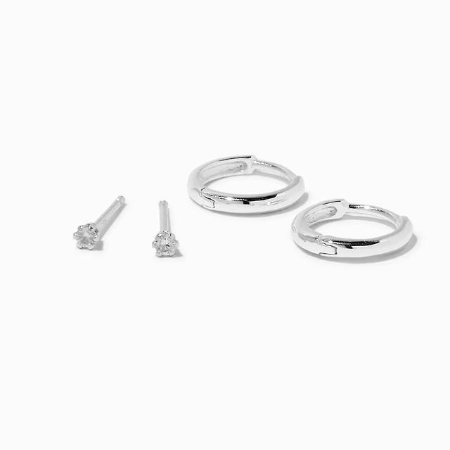 C LUXE by Claire's Sterling Silver Cubic Zirconia 2mm Round Stud & 8mm Clicker Hoop Earrings - 2 Pack