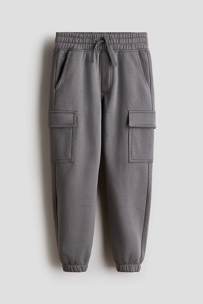 Cargo-style sweatpant joggers with soft, brushed inside. Decorative drawstring and covered elastic at waistband for added comfort. Diagonal side pockets, leg pockets with flap, and covered elastic at hems.