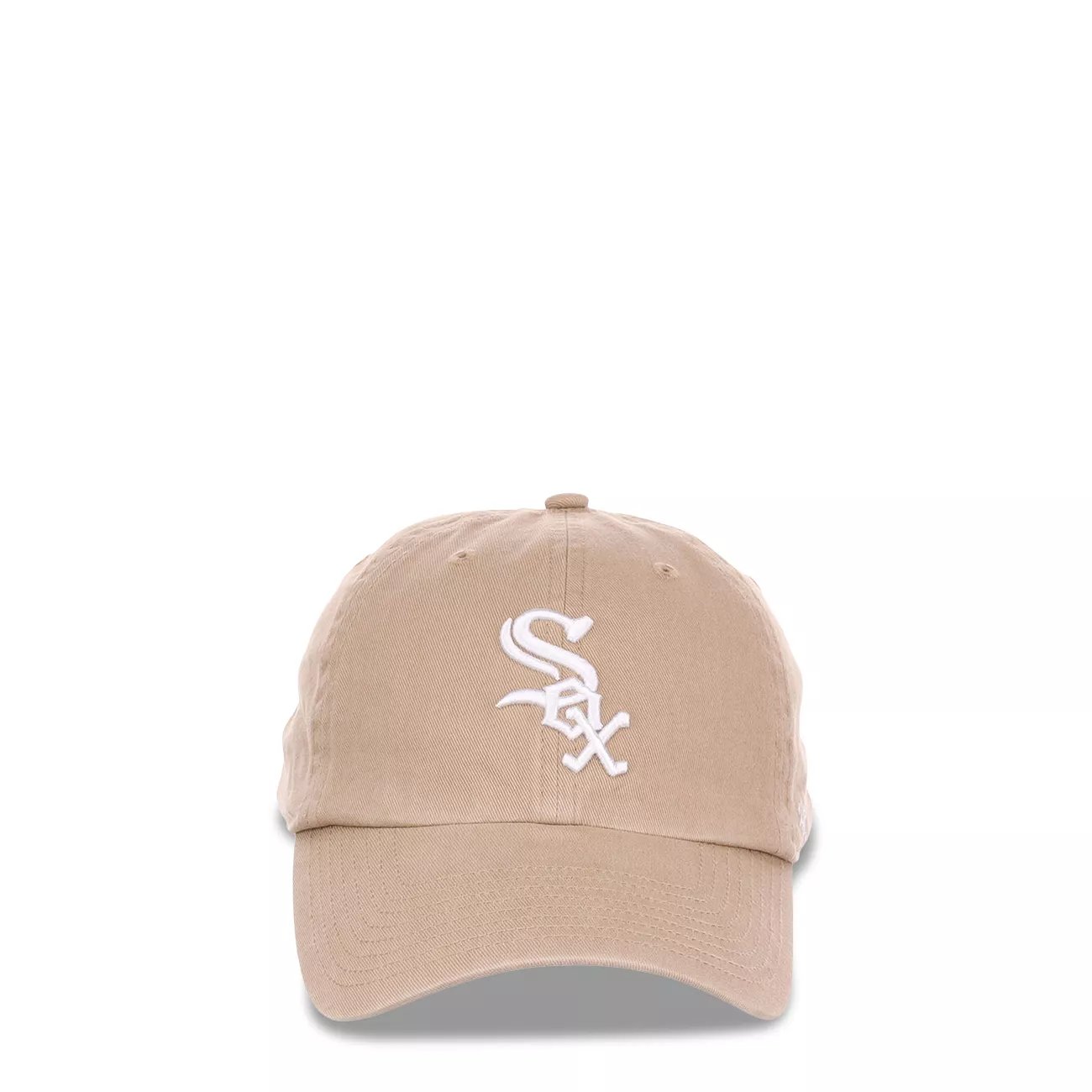 Stay cool in this ’47 Chicago White Sox MLB khaki/white (beige) adjustable clean-up cap. This cotton knit officially licensed hat has a relaxed fit and an adjustable fabric strap with snap buckle closure for pull-thru precise fitting. Features include a mid crown, slightly curved bill, six-panel construction with embroidered ventilation eyelets, and raised embroidery team graphics at front.
