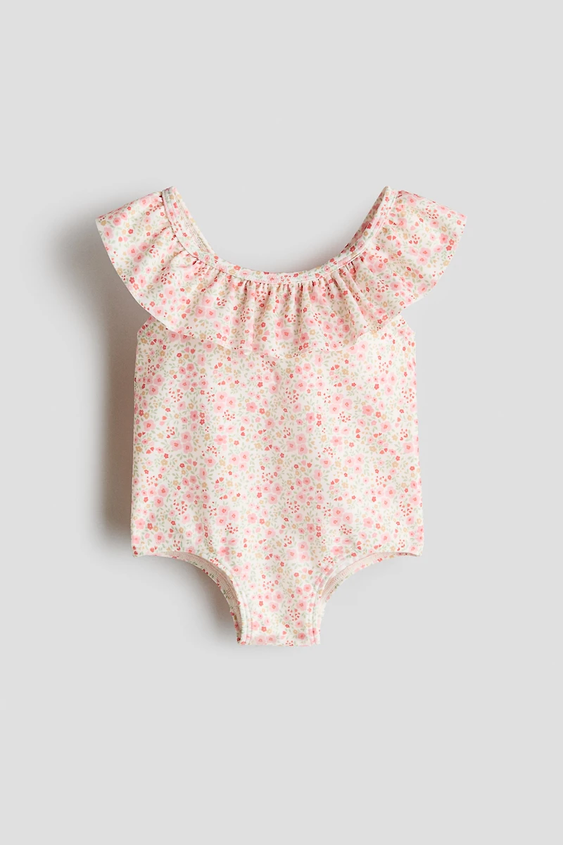 Costume de bain avec encolure à bord à volants et bretelles se rejoignant dans le dos. Fond doublé.