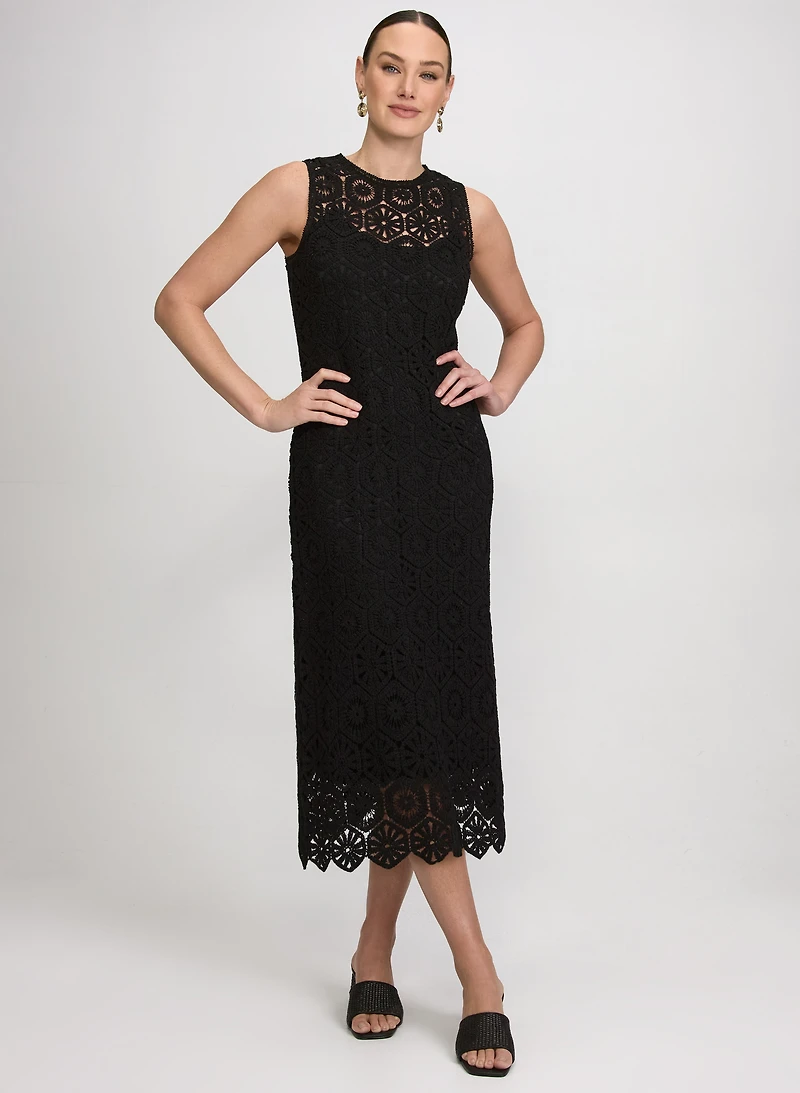 Our sleek midi dress features an all-over diamond crochet pattern for an on-trend, transitional style. Pair it with minimalist jewelry and a structured crossbody bag for an effortlessly chic daytime look. Straight silhouetteAll-over diamond pattern crochetCrew neck SleevelessIntegrated slip liningCotton fabricHighest shoulder point: 46"