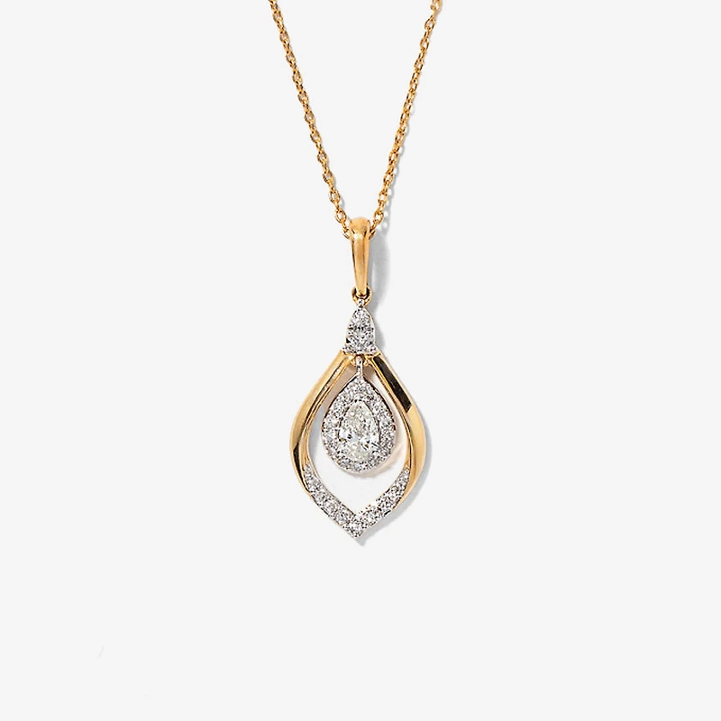 This outstanding diamond cluster necklace captures grace and beauty in every detail. Finely crafted in 10K yellow and white gold, it feature a 0.20 pear shaped diamond at its centre. An additional 29 accent diamonds are adorned on this fabulous design. Whether you're attending a special event, or simply looking to add