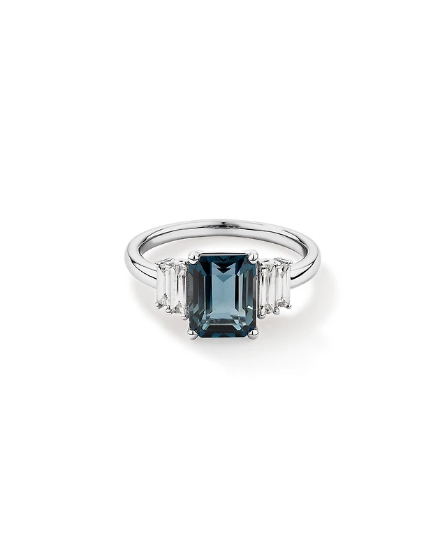 Emerald Cut London Blue Topaz Gemstone and 0.30 Carat TW Baguette Diamond Ring 14kt White Gold