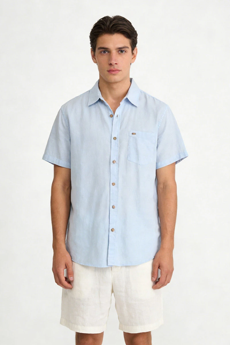 Island Haze's First Tide linen shirt features textured linen-cotton blend material, button-up front, collared neckline, and short sleeves.