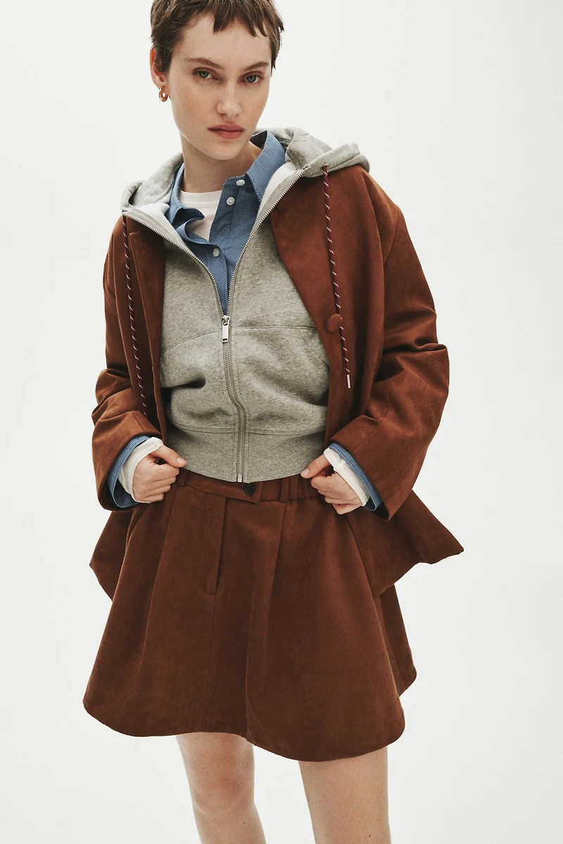 Flared mini skirt in woven fabric with a soft, napped finish. Regular waist, extended waistband tab with buttons, covered elastic at sides of waistband, and a zip fly. Gathers at top and discreet side pockets. Lined.