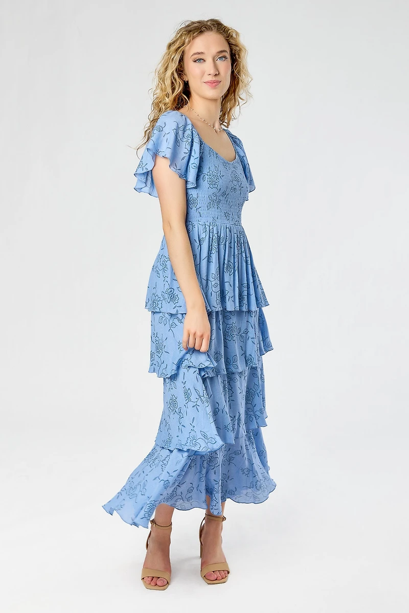 Floral Smocked Square-Neck Flutter-Sleeve Maxi Dress with Layered Tiered Skirt