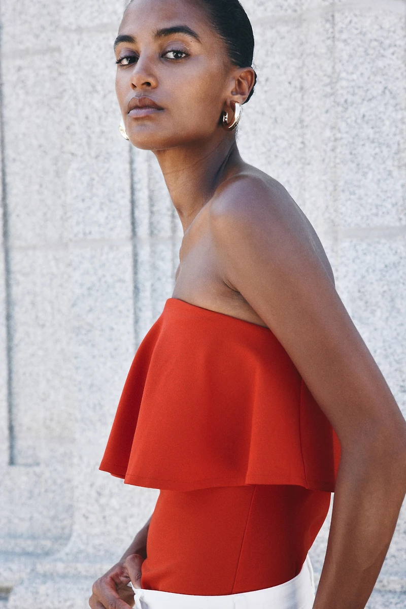 Fitted bandeau top in thick interlock jersey with a wide, flounced layer at top.