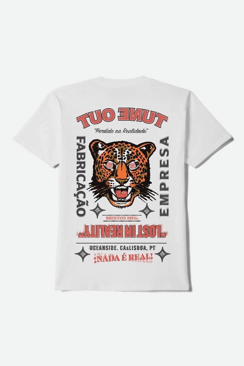 Fierce spirit in the everyday Brixton premium 100% cotton tee, featuring bold jaguar screen prints front and back. A standard-fit staple Getaway Tee with some bite, built for coastal cruising and neighborhood missions alike.  Men's t-shirt Crewneck Standard fit Front and back screen print Distressed art 100% cotton