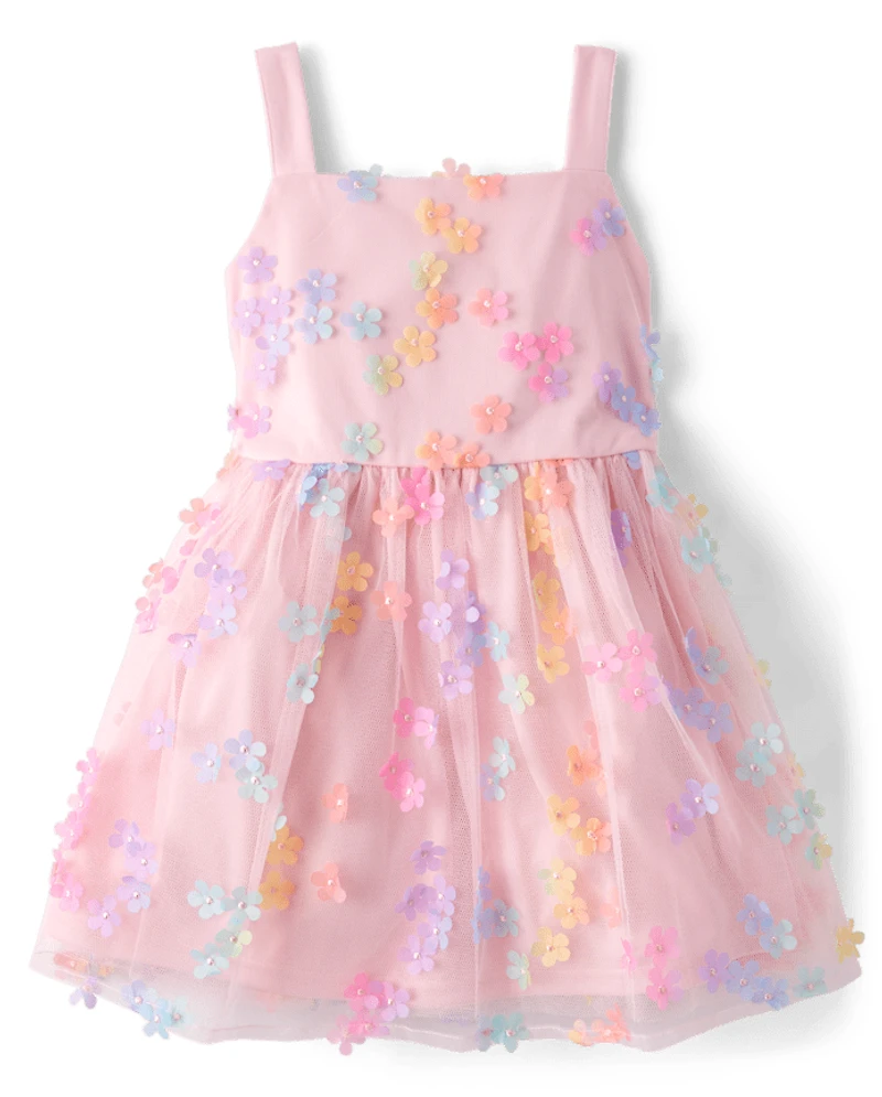 Girls Rainbow 3D Floral Mesh Fit And Flare Dress