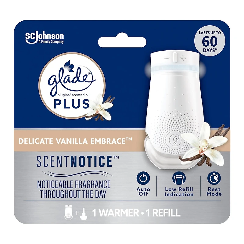 - <ul><li>SCENTNOTICE TECHNOLOGY: Enables scented oil warmer to provide noticeable fragrance through the day</li><li>NOTICEABLE FRAGRANCE: First Glade Plugins® with 4 waves of fragrance per day, designed to prevent nose blindness</li><li>LONG LASTING FRAGRANCE - Enjoy up to 60 days of fragrance* with Glade PlugIns Refills (*per refill, on low setting)</li><li>REST MODE: Two working modes to choose from so you don’t waste a scent: continuous or 8 hour rest mode cycle that saves energy and scented oil when you don’t need it</li><li>REFILL INDICATOR LIGHT: This Glade air freshener device includes an automatic light that indicates when it’s time to replace the refill</li><li>AUTO OFF: Designed with automatic shut-off that turns off when fragrance is empty</li><li>EXPERTLY CRAFTED FRAGRANCES: Infused with essential oils and crafted with notes of creamy vanilla, juicy plum, white orchid, vanilla blossoms and the long-lasting scent of lush decadence.</li><li>USE ANY REFILLS: This Glade air freshener device works with any of your favorite Glade PlugIns® refills</li></ul>