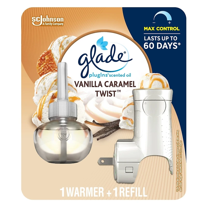 Indulge yourself with our Glade Vanilla Caramel Twist PlugIns Scented Oil Starter Kit. Crafted with fragrance infused with essential oils and ceramic heating technology, this product is our most adjustable warmer ever. Expertly designed to create a continuous ambience with longer lasting fragrance, you can use it to perfect the energy of every room. Simply plug it in, choose your settings and enjoy notes of Caramel, Vanilla, and Cream. This scented oil fragrance is masterfully designed to make your space sweeter.