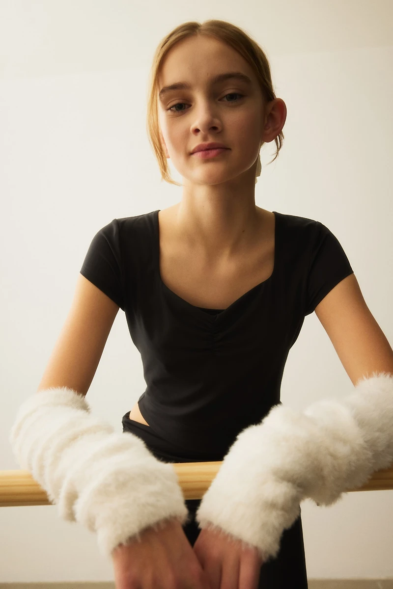 Slim-fit sports crop top in supersoft functional fabric made with SoftMove™ for the ultimate in softness and comfort plus contouring support, designed for every move. Sweetheart neckline with a ruched seam at center, and short sleeves.