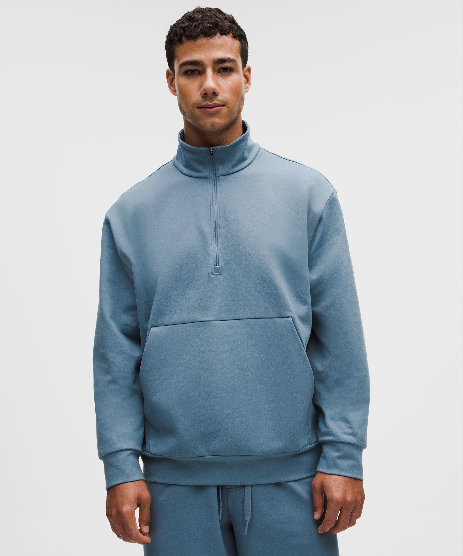 Laid back, levelled up. Made of weighty, blanket-soft jersey fabric with a brushed interior, this half zip provides the elevated downtime you deserve.