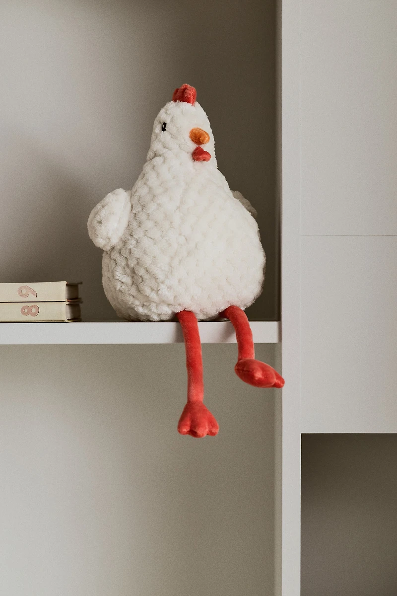 Hen-shaped soft toy in fluffy pile with a round, huggable body and colorful details.