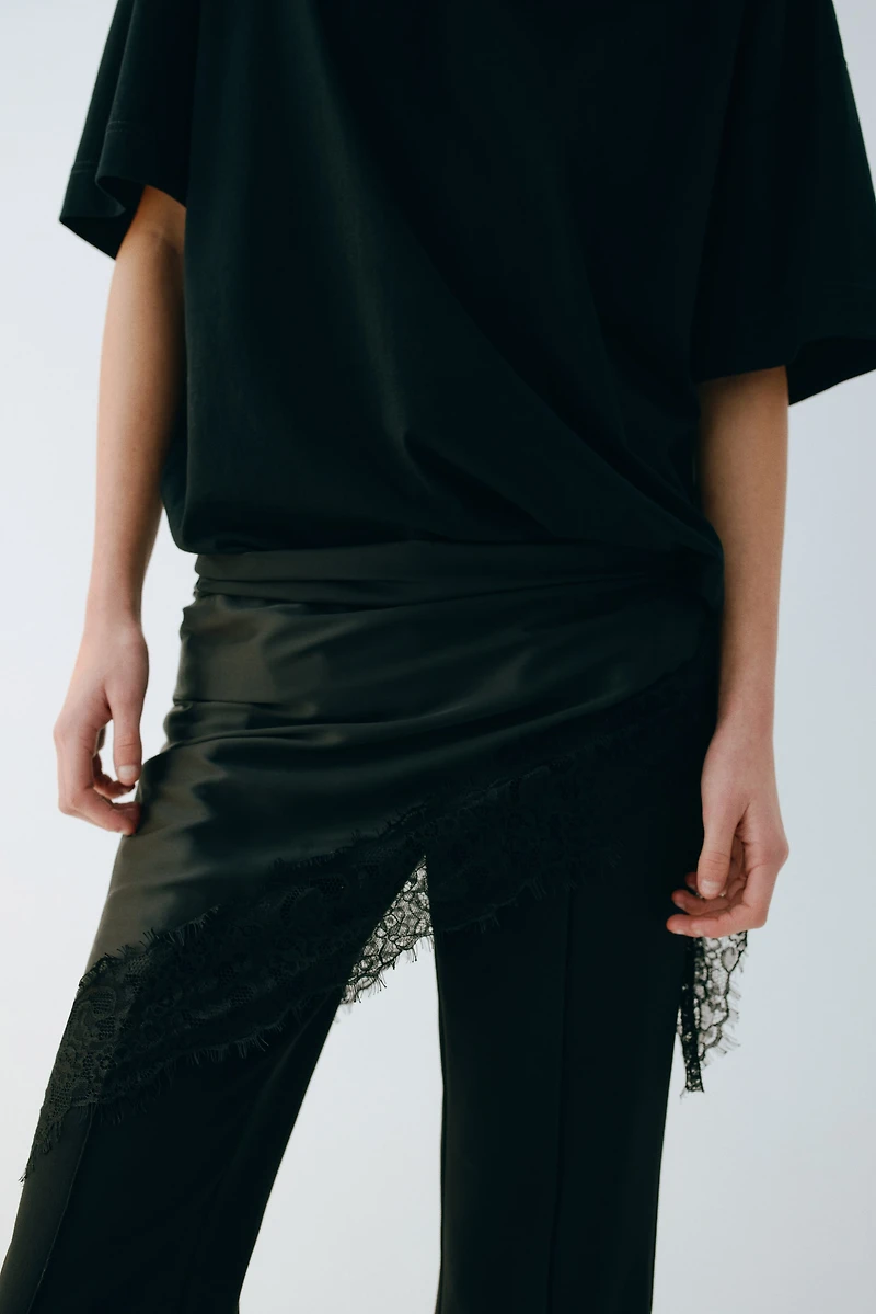 Large triangular scarf in softly draped satin with lace trim at two sides.